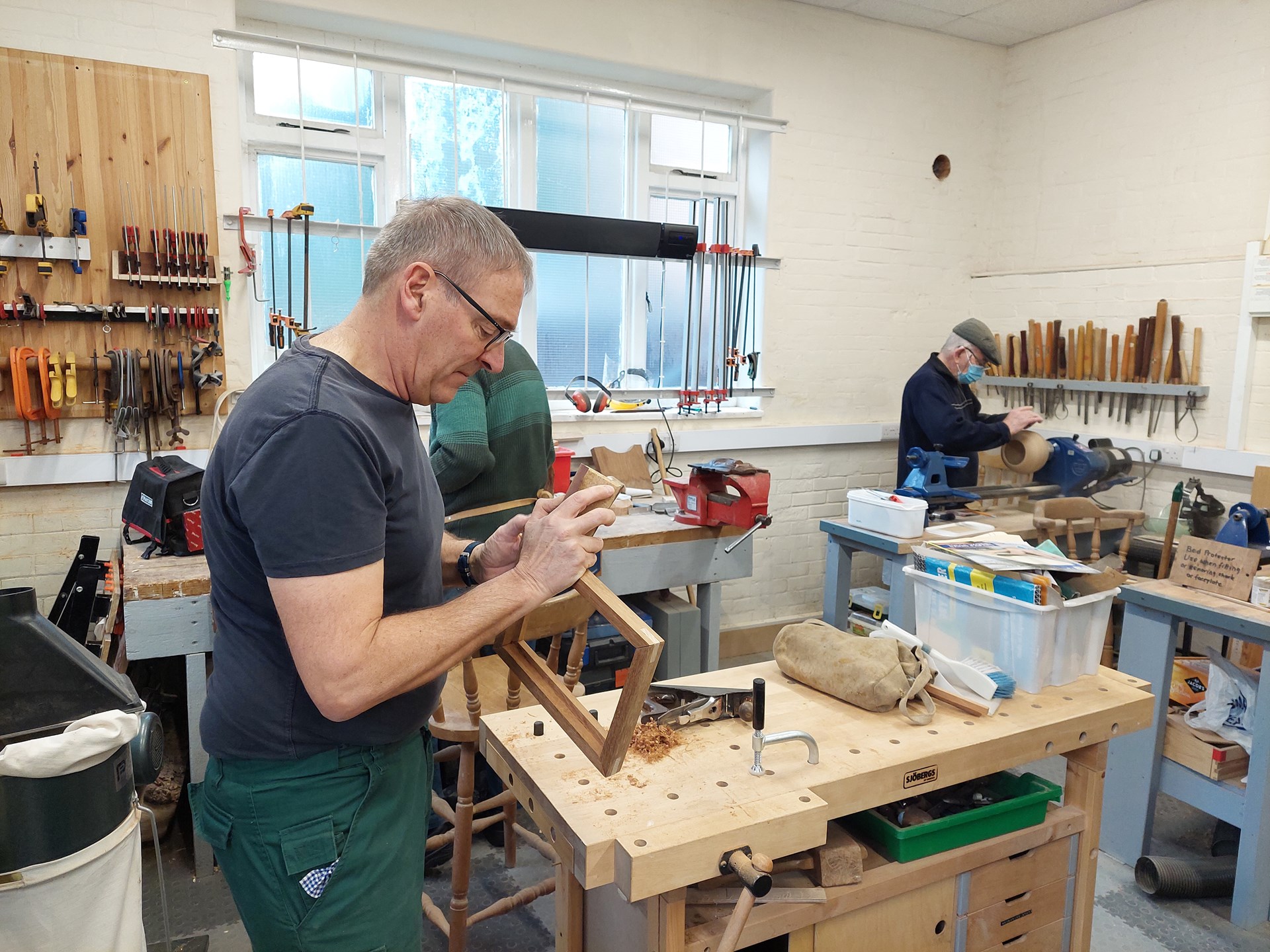 We have a well-equipped workshop including wood and metal lathes, chop saw, table saw, wood planer, pillar drills and numerous hand tools. There’s plenty of space to work on your own projects or just pull up a chair, enjoy a coffee and see what’s going on.